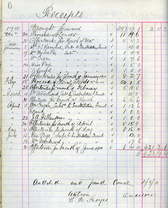 The income reveals the parish efforts to attract people and raise funds. Proceeds are recorded from a lecture given by David Albert, the bazaar, which was a significant amount, monthly collections from around the district are recorded and alongside, the names of collectors. These names can offer a tantilising insight for the family researcher into their forebears interests, activities and participation in Church life.