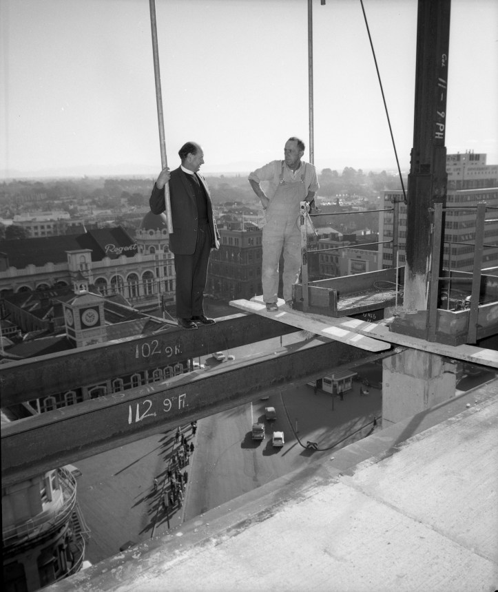 Taken in 1966 at the new BNZ building site on the south side of Cathedral Square in Christchurch, a jovial looking Rev Hadfield stands precariously on a steel girder projecting from the building. One notes that there is nothing under him except airspace. It now seems quite incredible that such a nonchalantly posed image could be taken – and with the express intention of publishing in the Presbyterian journal of the day.
