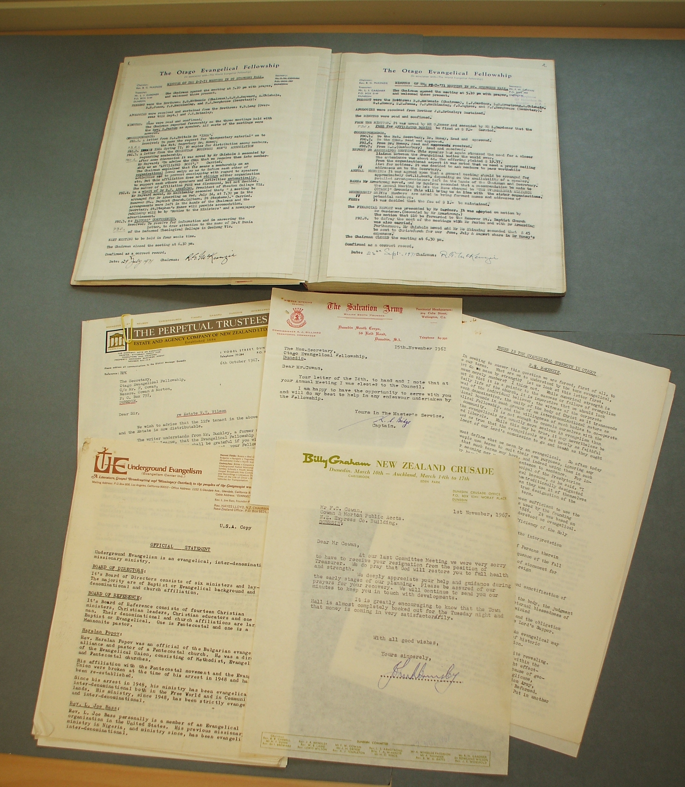 The most recent collection I have described for the Presbyterian Archives is the Evangelical Alliance (Otago). This collection came through the estate of the Rev. Roderick McKenzie. He held office in this organisation while he was minister at St Stephen’s Parish in Dunedin (1958-1977). When he moved to his last parish at Waikouaiti this collection obviously accompanied him. The last recorded Minute, the 1976 Annual Meeting, suggests that the leadership of the group had thinned out considerably and although members were appointed to the Council under McKenzie’s leadership the group appears to have gone into recess.