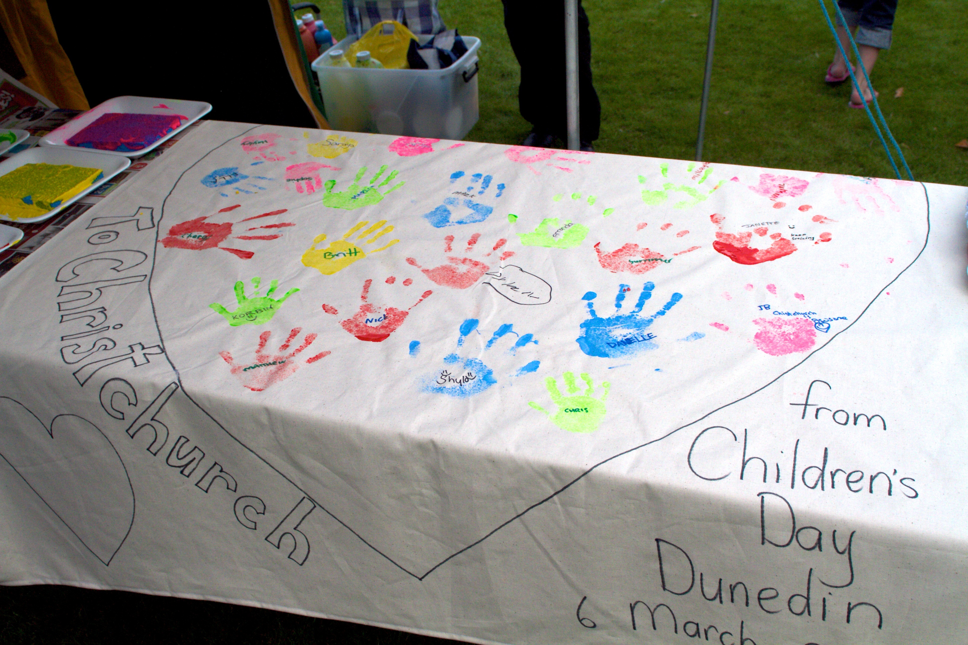 Also on Sunday Kaikorai and Flagstaff organised a Children’s Day: Fun in the Park event. One of the more popular activites was the making of a banner under Cheryl Harray’s guidance with messages of love to Christchurch. I understand there are now two banners with about 130 handprints in total.
