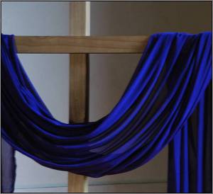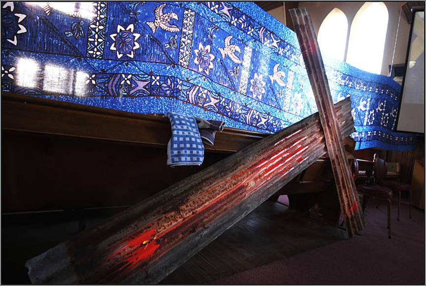 Red stained cross made from corrugated iron resting against Pacific Island cloth dividing pews from worship area at The Blue Lagoon.