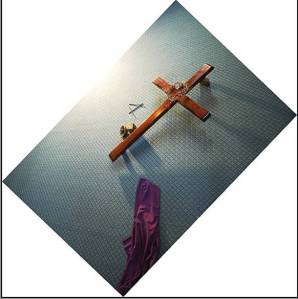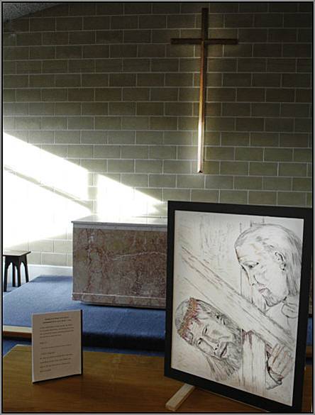 Illustration, Simon of Cyrene carries the cross, on display before the Altar at St Martin’s Anglican Church.