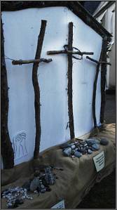 Three crosses and stones on display outside Sacred Heart Catholic Church.