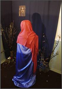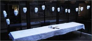 The Last Supper was set up by Meegan and Alan Cloughley at Ross Home, the Presbyterian Support Retirement Home in North East Valley. Thirteen masks were carefully strung up around a table to represent the last supper. If you look carefully one of the masks is reversed. The installation was set up in a courtyard within the main building of the site and could be viewed on all four sides.