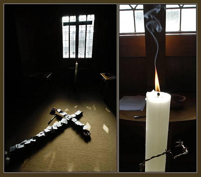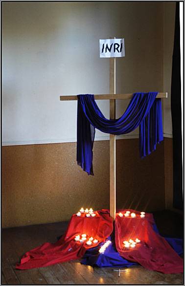 Cross and candles at Nga Maara Hall, Sacred Heart Catholic School, prepared by the children of the school.