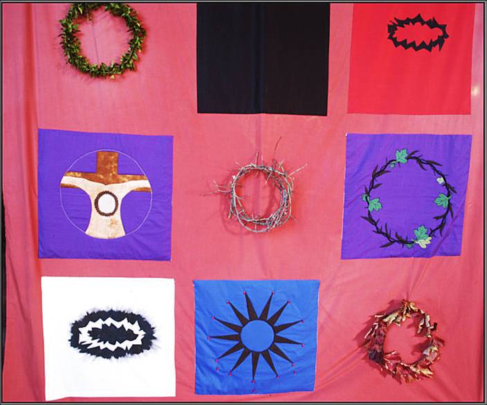 The suburb of North East Valley in Dunedin is defined by North Road with streets of housing radiating out from it. It was once the main road to satellite towns north of the city. Now Highway 1 bypasses the suburb completely. Even so North Road is a busy street in a suburb that maintains its own identity with old family homes, a diversity of townships, and student flats. Two schools at each end of the Valley provide the educational centres of the suburb. Nearly all of New Zealand denominations are represented on North Road, in order going south: Baptist, Presbyterian, Anglican, Pacific Island Presbyterian, Methodist, Roman Catholic, Salvation Army. Two other Presbyterian churches are sited in the hill suburbs on either side of the valley. This creates a natural route for the annual inter-denominational initiative the Good Friday Procession of the Cross, ending with meditations and worship in the lower Botanic Gardens just beyond the south end of the suburb in the Dunedin City green belt. In 2007 the churches also worked together to provide art for Easter meditations at the churches along the Valley. The photographs of this installation were taken by the Rev. Dr Susan Jones during her ministry at one of the Presbyterian churches of the North End.